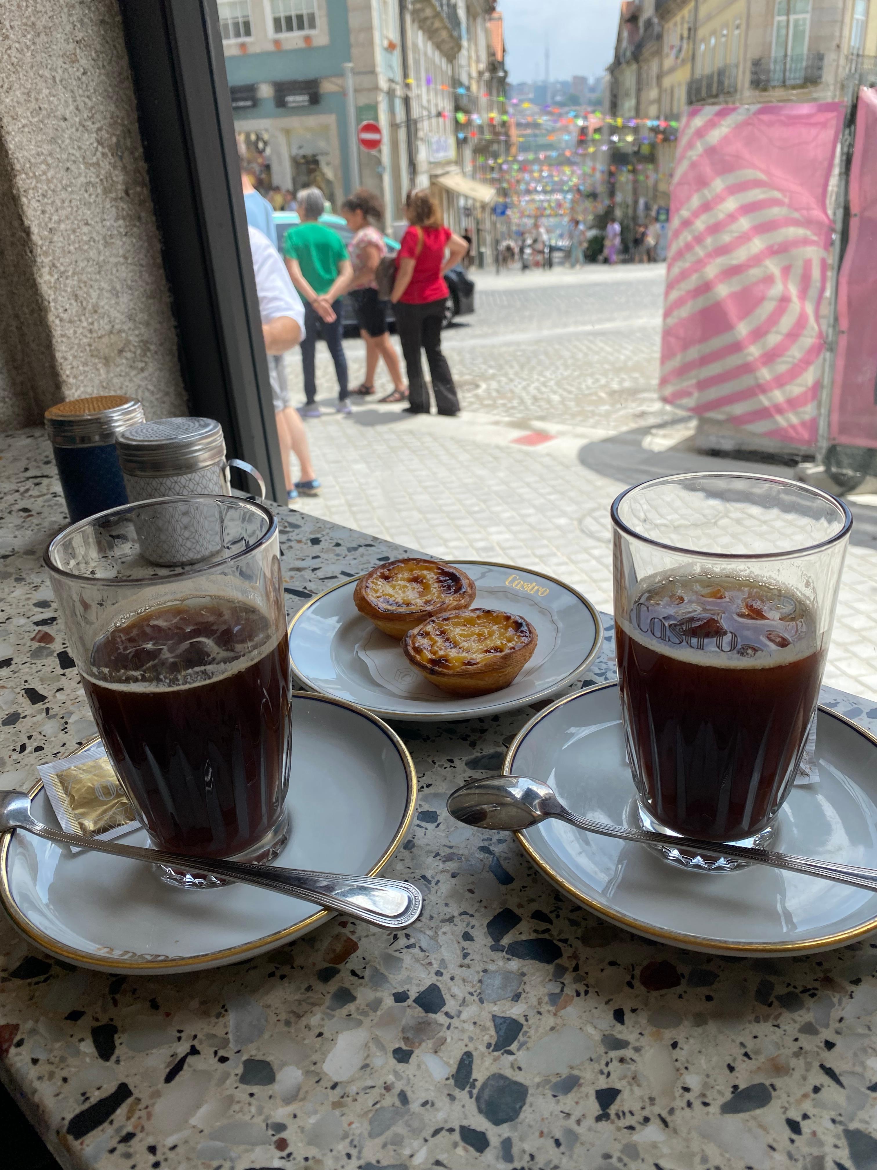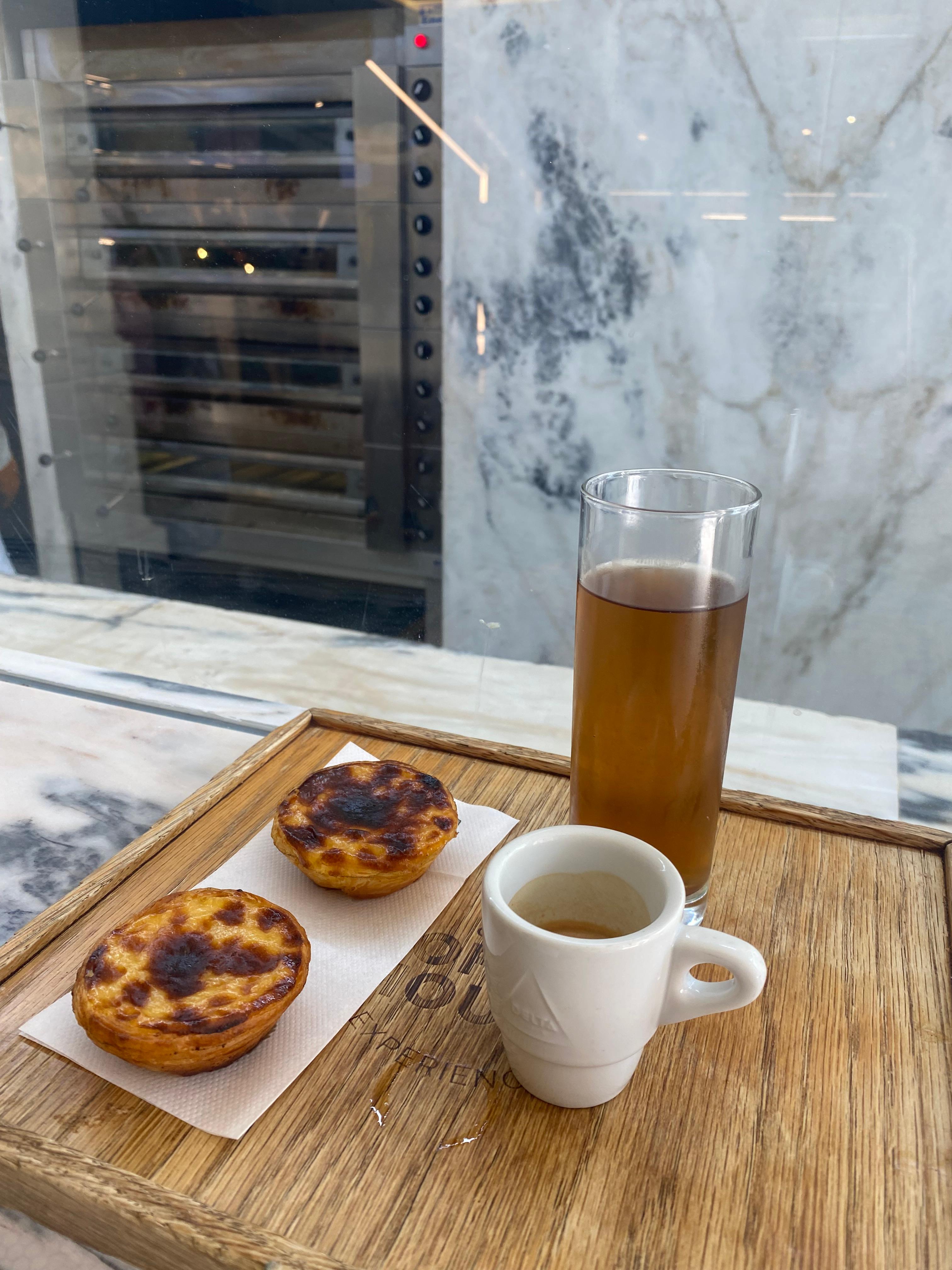 Pastel de nata and refreshing iced tea at Manteigaria near Bolhão Market.