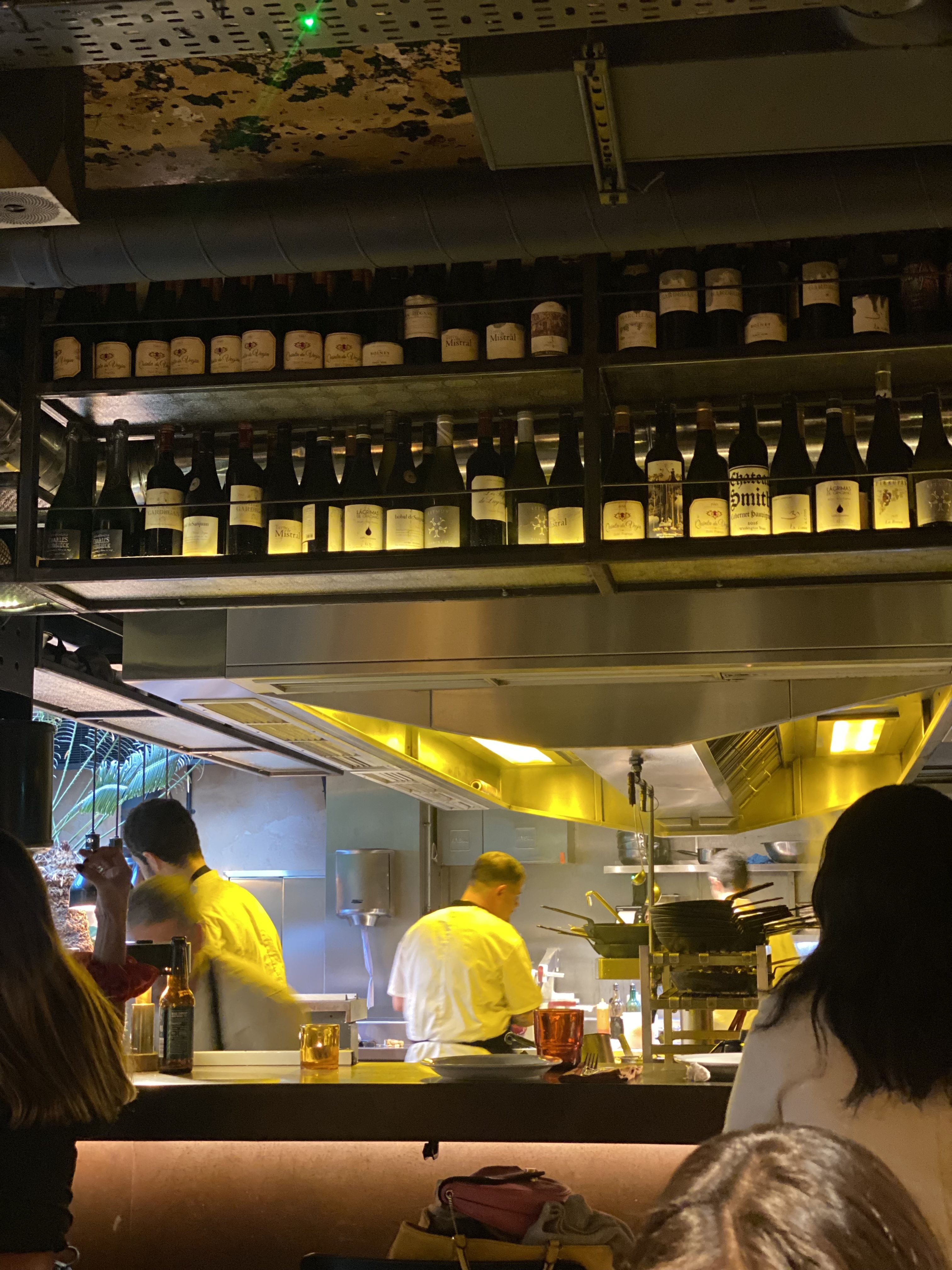 The space is warm, a bit dim, with that open kitchen energy.